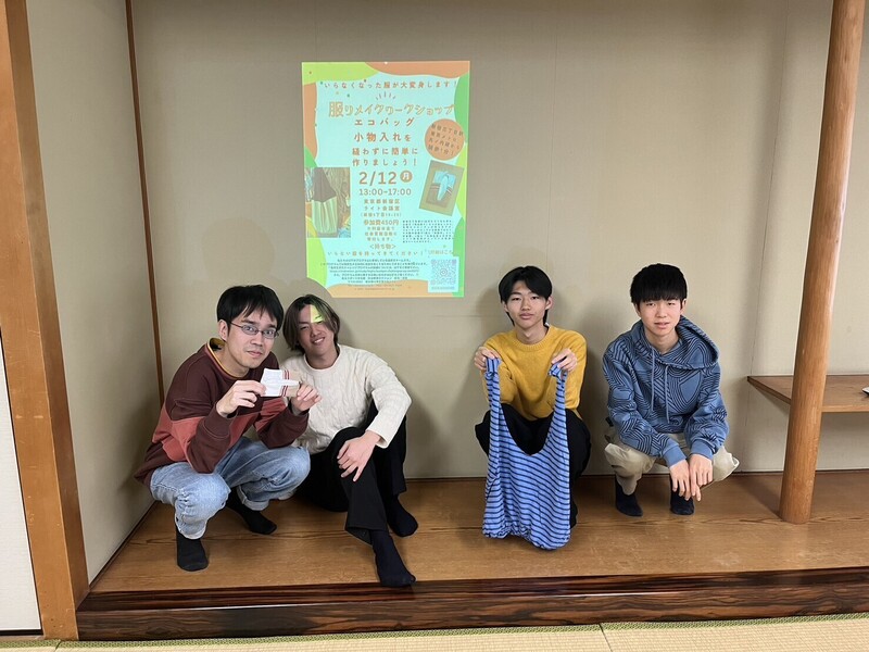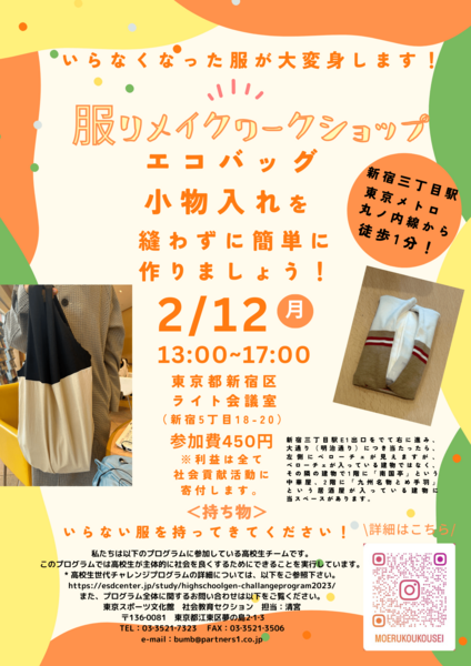 イベントの服の廃棄量についてのスライド説明を聞いていただいた後、実際に服のリメイク方法をレクチャーし、実際に廃棄寸前の服を使用してエコバッグやティッシュケースなどを作っていただきます。なお、リメイクして出来たものは持ち帰っていただけます。子供から大人まで参加可能です!是非ご参加ください!