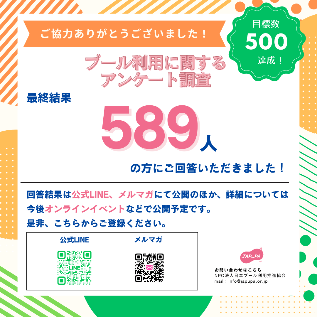 JAPUPAの活動である「研究・(プールの魅力の)広報・(プールし利用をスムーズにするための)提言」において具体的に何をすべきかを明らかにするため、プールを利用している人・利用していない人がどのくらいおり、プールに対してどのような意識なのかを調査を実施。