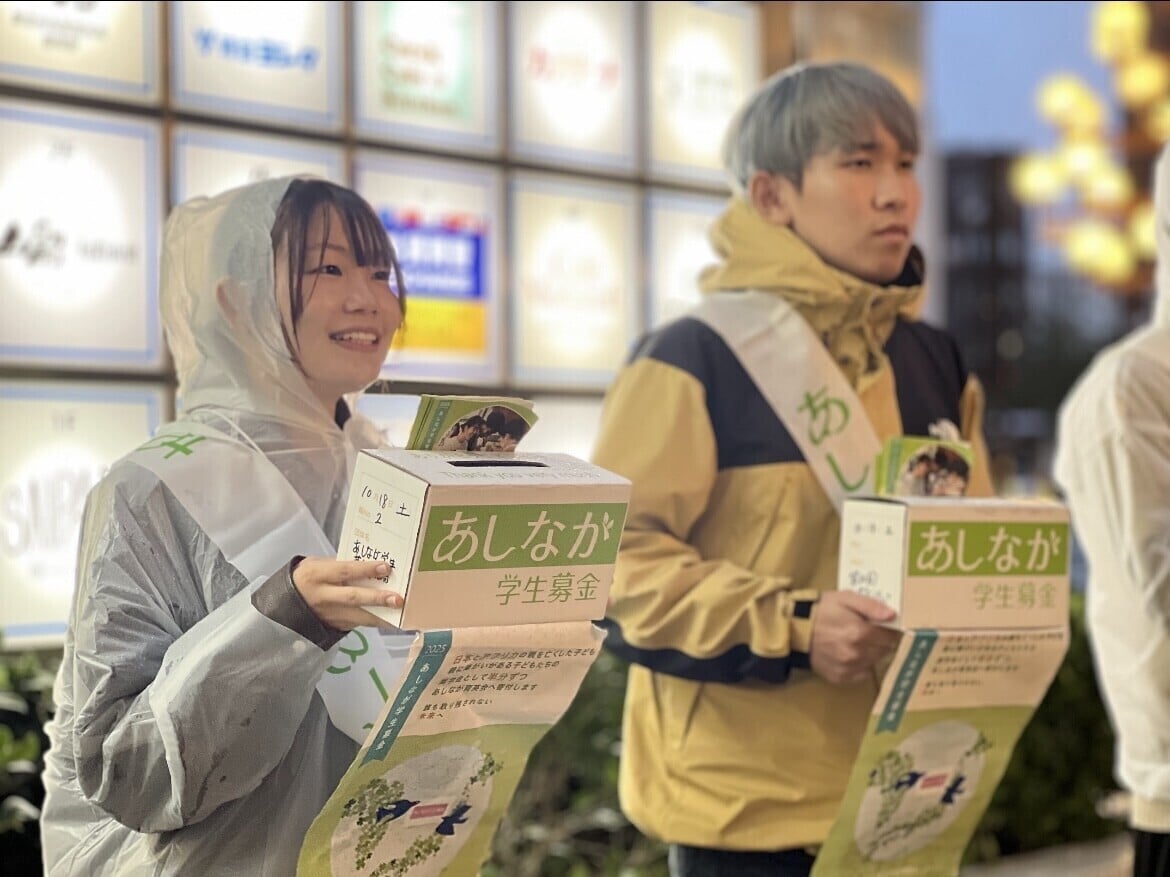 10月18.19.25.26日に全国で秋の街頭募金を行いました。雨天時での開催となりましたが、大学奨学生や高校生のボランティアスタッフのご協力のもと、大きなトラブルもなく無事に終えることができました。
