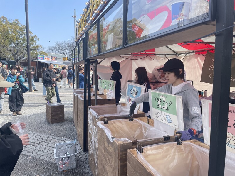 来場者が自分の手でごみ資源を分別できるようにする "ごみ資源の分別ナビゲート" や、ごみの根本削減に取り組む "リユースカップ・食器"の導入など、イベントの環境負荷を下げるための活動をボランティアと一緒に運営しています。