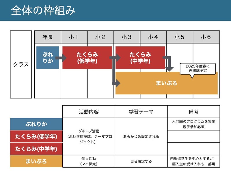 小学校低学年・中学年クラスのプログラムは「ふしぎ探検隊」と「テーマプロジェクト」の二本柱で構成されています。