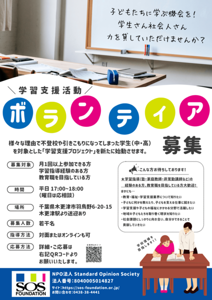 - ボランティア募集】不登校学生を対象とした「学習支援プロジェクト」を開始します。