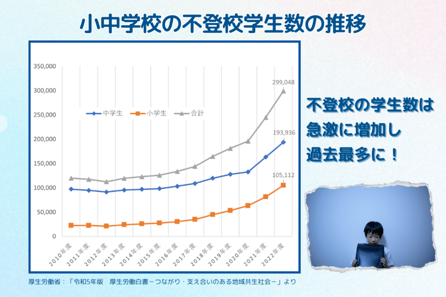 子どもの不登校の数は年々増加しており、文部科学省の調査によると2022年の小中学校の不登校児童生徒数は299,048人と過去最多となっています。