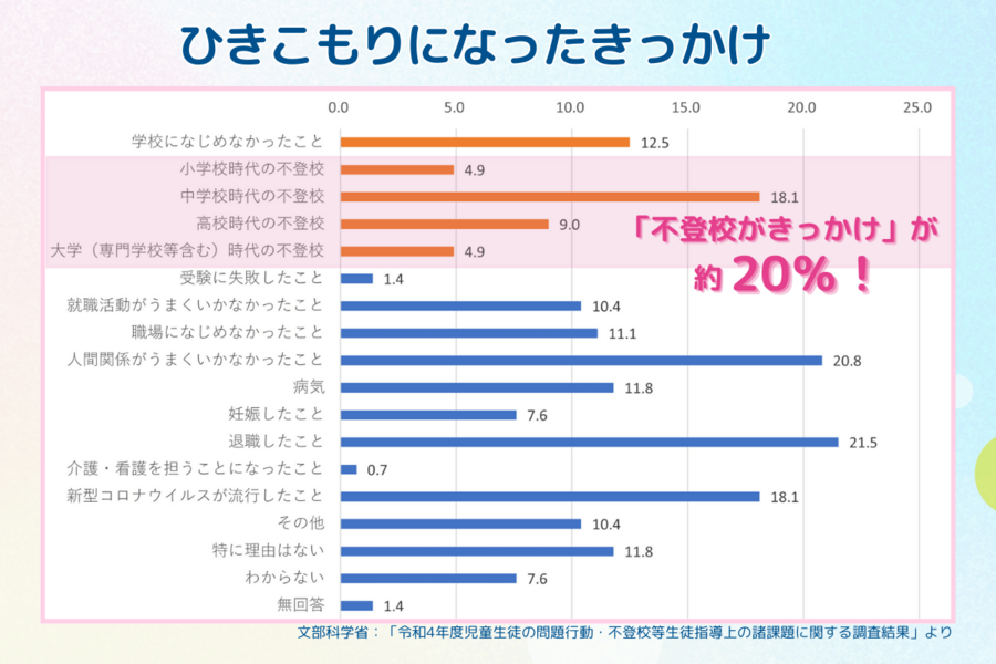 不登校がきっかけでその後、長期にわたりひきこもりになるケースもあり、内閣府の調査でも、ひきこもりの約20%が、不登校がきっかけと回答しています。
