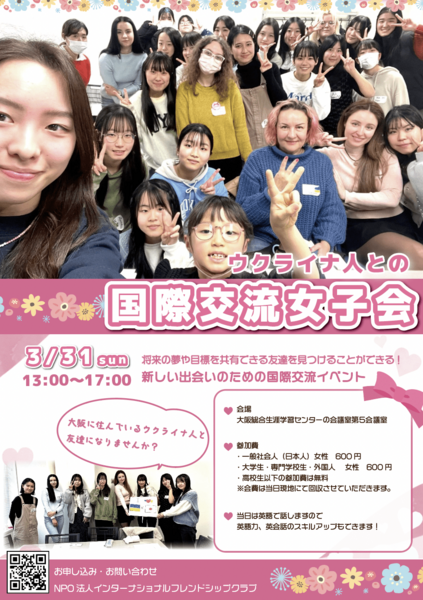 感想: この活動を通してウクライナの方と日本人の方、そして中国人の方等、言語が異なる方たちでコミュニケーションを取りお互いについて知ることができました。高校生も多く、女子だけということもあったので安全に安心して参加することができました。英語が流暢でなくてもとても楽しかったです。ウクライナの方にはもちろん日本でいろいろな経験をして楽しい思い出を作って欲しいですがこのような経験を通して日本人の方も良い思い出を作り自分の成長の糧になれば素晴らしいなと思いました。