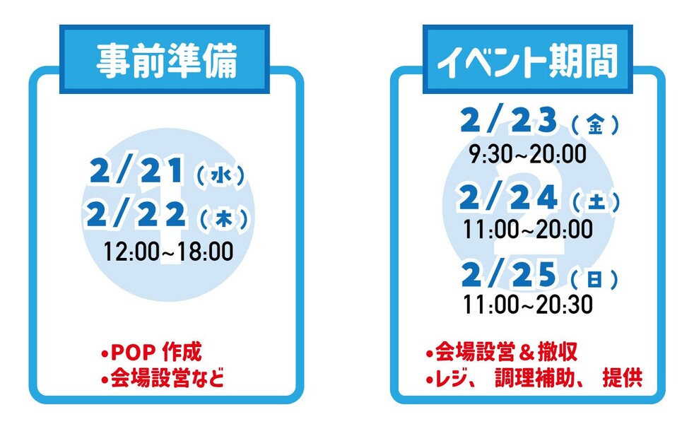 ◉イベント当日:午前からお手伝い頂ける方、昼食付き。