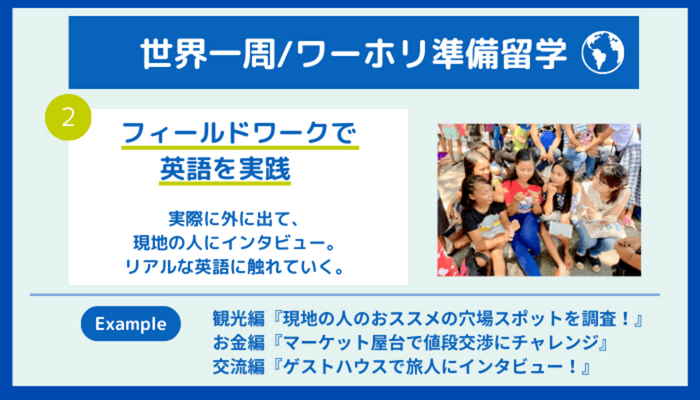 ②午後3時間 フィールドワーク (実際に現地の人と交流 アウトプット)