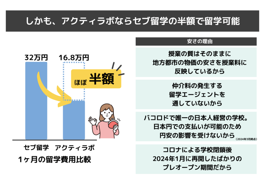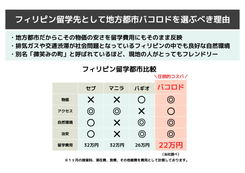 当校はフィリピンの中でもリーズナブルな価格で提供をしています。