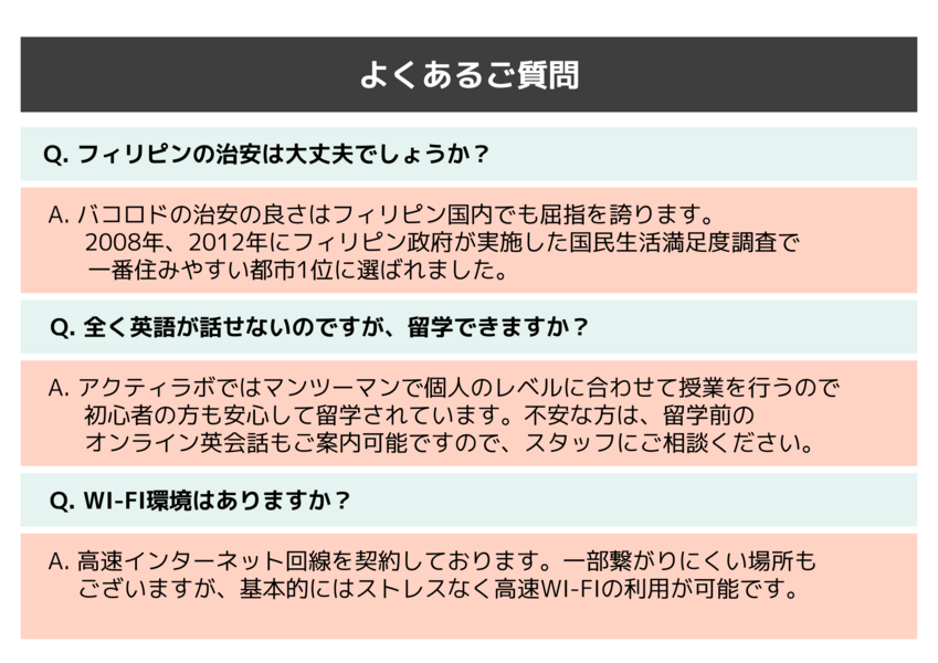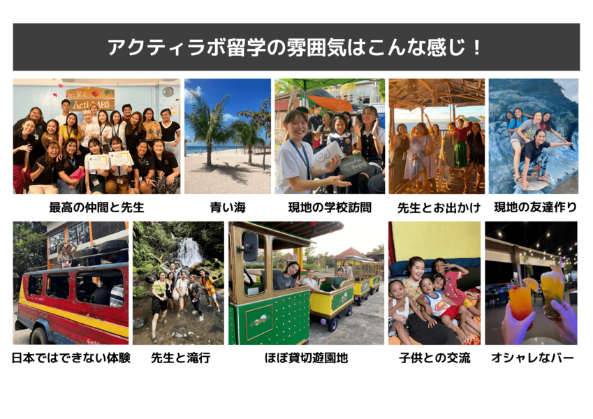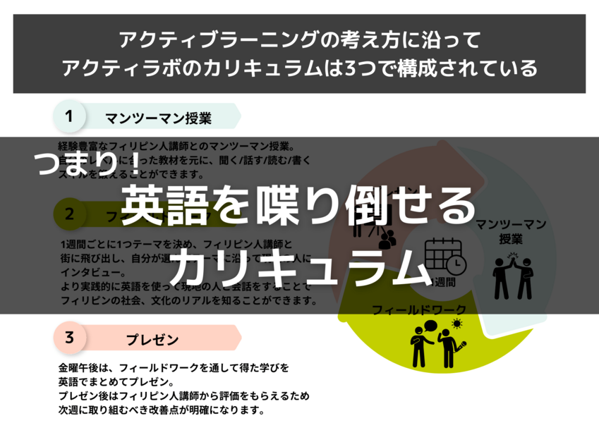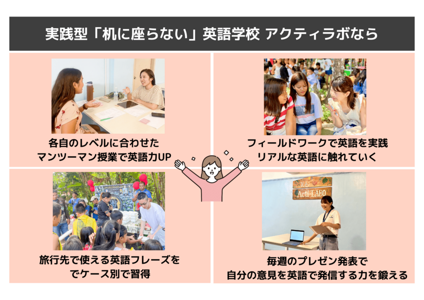 Acti- LABO(アクティラボ)は、留学従来のスパルタ式の詰め込みカリキュラムでなく、世界の教育界で注目されている「アクティブ・ラーニング(実践型学習スタイル)」のフィリピン英語学校。