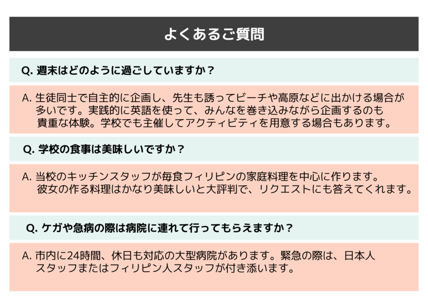 わたしは4人部屋で、同じ部屋の子とはフィリピンで初めて会いましたが、そんなことも忘れてしまうくらい仲良くなれてとても嬉しかったです。はじめは1人で参加することが怖かったですが、共同生活を通して仲の良い友人をたくさん作ることができました。シャワーやトイレなどは、初めはフィリピンのスタイルに慣れないことも多くありましたが、滞在していくうちに慣れ、何も不便なく過ごせるようになりました。