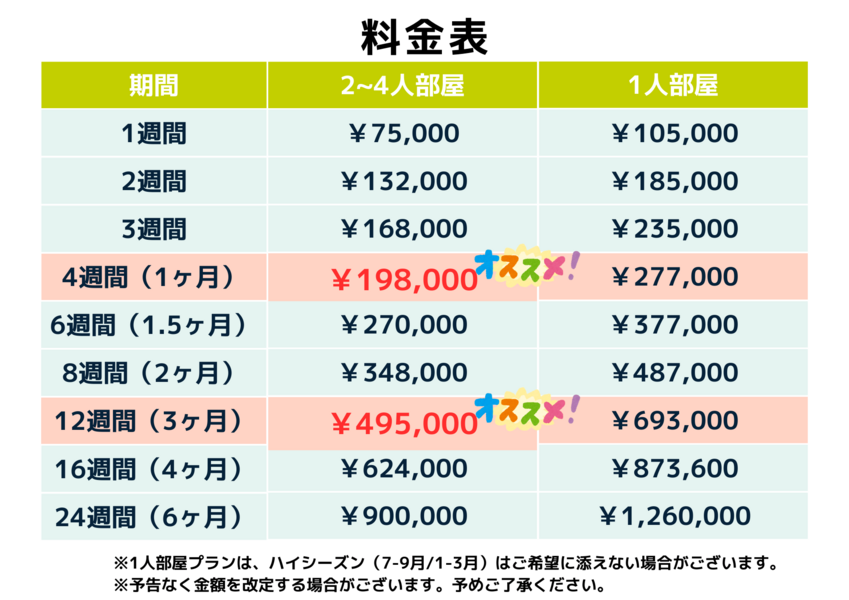 1週間~6ヶ月間 ・1週間〜24週間 (6ヶ月間)まで受け付けております。平均4 -12週間滞在の方が多いです。 |