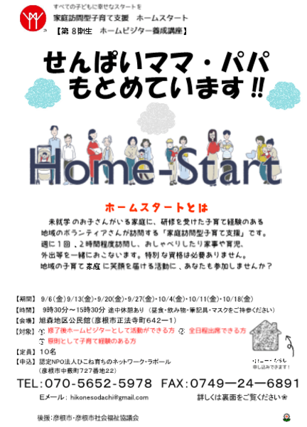 ホームスタートは、専門職による子育て支援とは違い、子育て経験者が、友人のように親の気持ちに寄り添いながら話を聴いたり、育児家事や外出を一緒にするボランティア活動です。「外出しづらい」「頼れる人が身近にいない」そんな彦根の子育て家族に笑顔を届けるホームビジターの活動にあなたも参加しませんか?