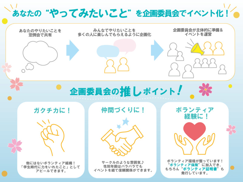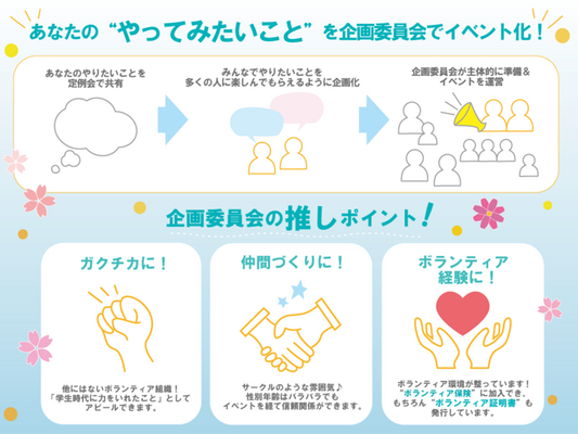 自分のために、誰かのために、何かをやってみたいと思った人は、ぜひ企画委員会として活動してみてください。
