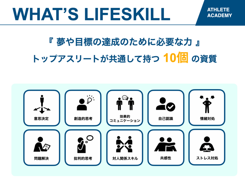 ライフスキルとは、 WHO(世界保健機構)が提唱している、自分自身で人生を切り拓くための10個の普遍的なスキルです。・問題解決