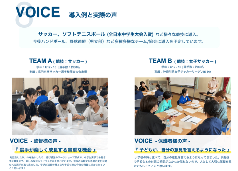 このライフスキルは、欧米ではスポーツ育成の現場に導入され、競技力の向上をはじめ、学習意欲 / 生活態度の変化、スポーツを引退した後のセカンドキャリアやスポーツで得た力を社会人能力へと転換させる上で非常に大きな効果を発揮しています。