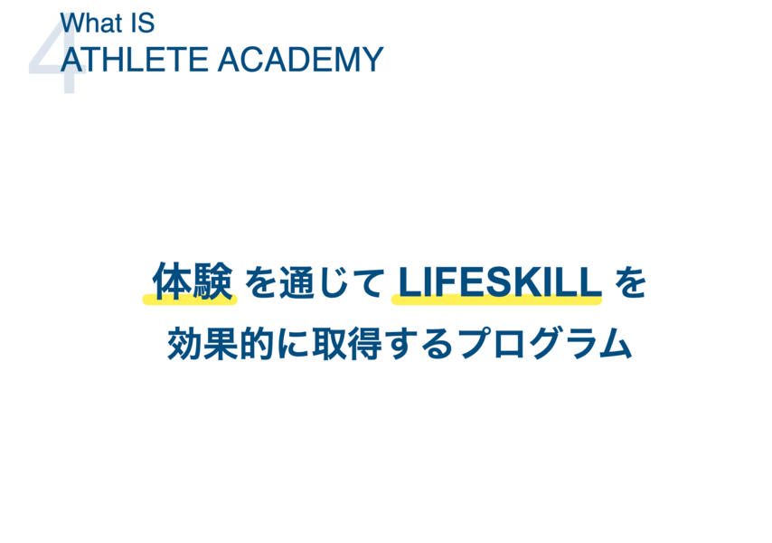 アスリートアカデミーとはアスリートアカデミーでは、ただ競技を楽しむだけではなく、競技面でも競技以外の社会活動でも、明確な目標を持ち、課題に立ち向かい、自走自立をしながら周りに勇気や希望を与えられるアスリートに育つ環境を提供しています。