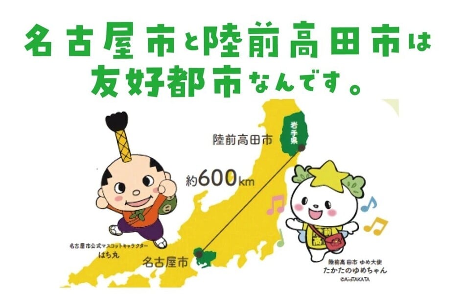 名古屋市と岩手県の陸前高田市は、平成23年3月11日に発生した東日本大震災を契機に、名古屋市が開始した行政"丸ごと支援"が縁となり、市民の交流も広がるなど、強い信頼関係を築いてきました。両市は友好都市の協定を結び、お互いのまちを思いやり、まちの魅力を共有し、共に発展することを目的として、交流を末永く続けているんです。