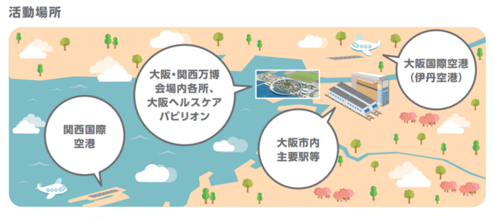 万博会場内、大阪市内の主要駅、関西国際空港、大阪国際空港(伊丹空港)、大阪ヘルスケアパビリオンでの活動がございます。 |