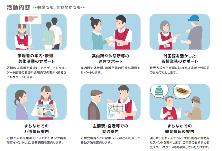 | 活動内容 | 来場者への案内及び美化活動の補助、 来場者サービス施設 (案内所・休憩所・救護所等)の運営の補助、 外国語を活かした各種業務の補助 など | ・主要駅、空港等での万博情報、 交通情報、観光情報の案内 など ・大阪ヘルスケアパビリオンでの案内や 観覧サポート など |