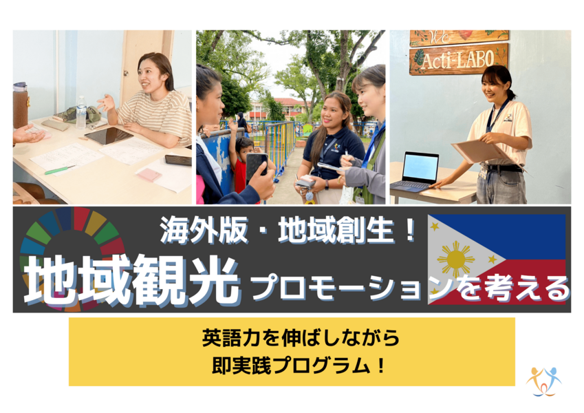 世界の人々と交流するための英語力、途上国のリアルに触れて心が動く現地体験の2つを得ることができるのが、アクティラボが運営する『海外版・地域創生 in🇵🇭』地域観光プロモーションを考えて即実践プログラム!