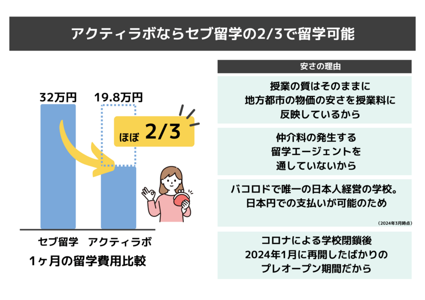 Acti- LABO(アクティラボ)は、留学従来のスパルタ式の詰め込みカリキュラムでなく、世界の教育界で注目されている「アクティブ・ラーニング(実践型学習スタイル)」のフィリピン英語学校。