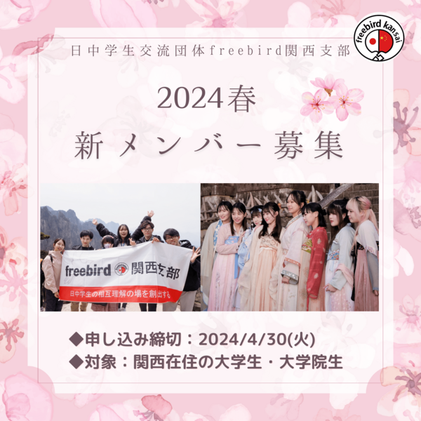 この募集の受入団体「日中学生交流団体freebird関西支部」をフォローして、