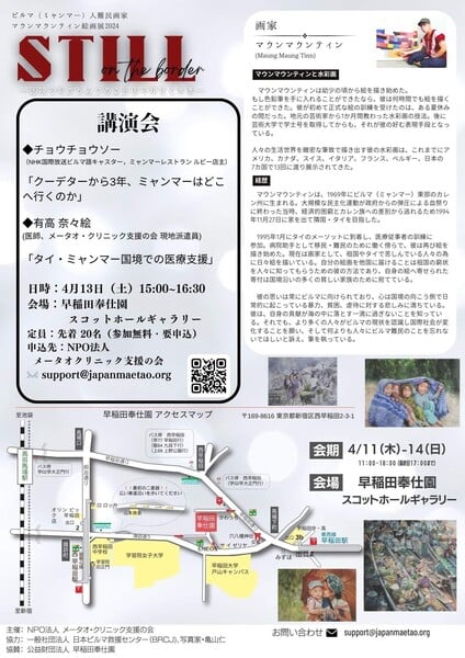 ビルマの難民画家マウンマウンティン氏の絵画 22点の展示に加え、NHK国際放送ビルマ語キャスターのチョウチョウソー氏と、メータオ・クリニック支援の会現地派遣員の有高医師の講演会、作品販売を行います。