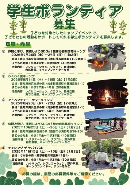 - 夏・秋1泊2日、2泊3日の子どもキャンプのボランティア募集!