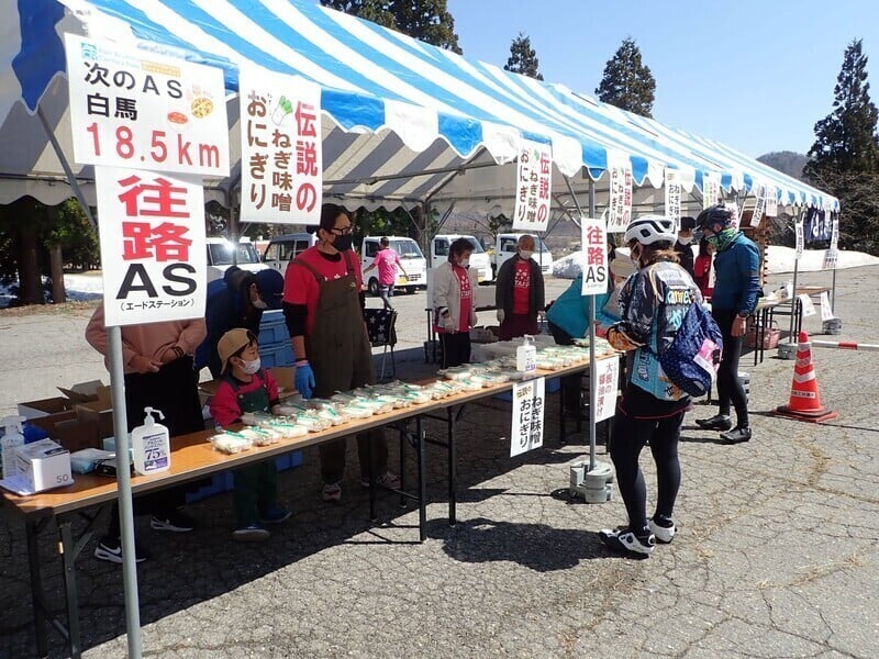 地元の小学生2人がボランティアで参加して、エイドの目玉でもある「ネギ味噌+漬物+おにぎり」のパックを作ったり、ライダーさんにお渡ししたりで大活躍!かわいいボランティアの対応に、思わずニコニコ顔になってしまったライダーさんも多かったのでは?