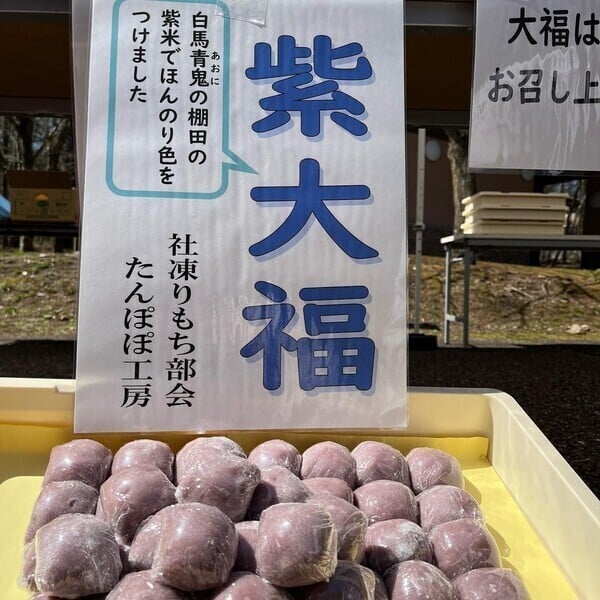 ねぎ味噌おにぎり(大北産米)、こしあんのお焼き、冷奴+安曇野のわさびこのボランティアの雰囲気