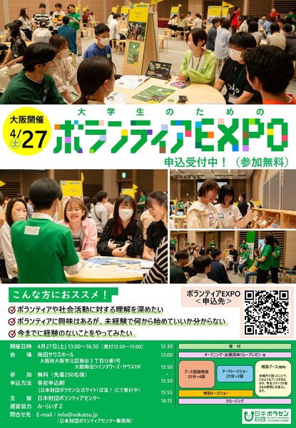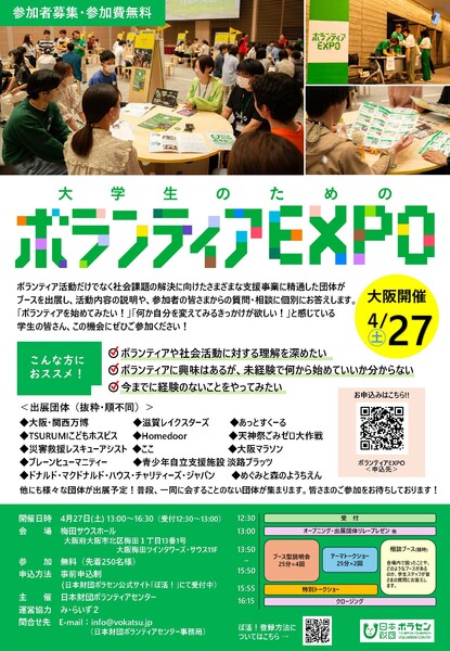 【4/27(日)大阪】ボランティアをやってみたい。という学生の皆さんにピッタリのイベント「大学生のための、ボランティアEXPO」を開催。関西の20団体が集結します。大阪万博もボランティア募集します!
