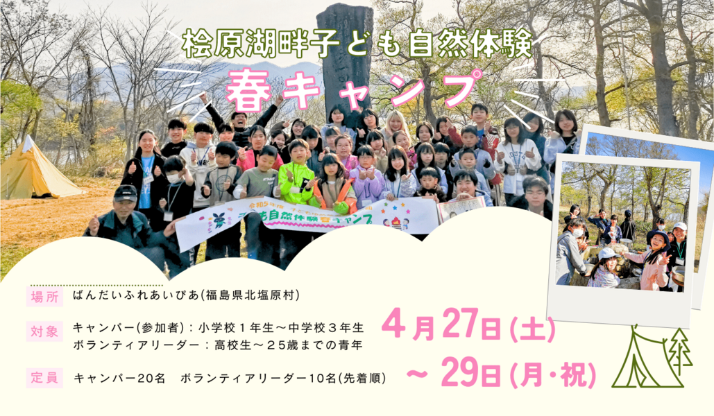 - 「桧原湖畔自然体験「春」キャンプ」2泊3日子どもたちのお世話ボランティア募集!
