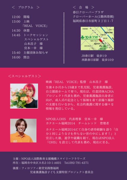 子どもたちの幸せを願う沢山の新しい仲間との出会いに向けて、無料上映会「REAL VOICE」の開催プロジェクトを開始します。当日は監督の山本さんに加えて、カナエール福岡2024スピーチ大会・最優秀審査員賞の受賞者 KAZU の登壇が決定。5/19、熱気あふれる会場で、子どもたちの未来について、皆様と熱く語り合える一時を心より楽しみにしています。