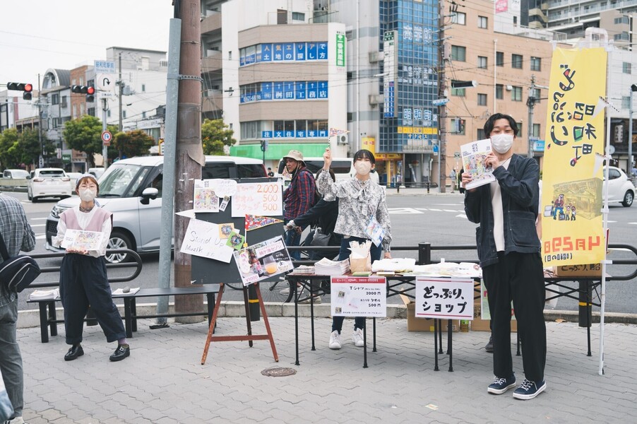 昭和町駅前のカフェ「CLIP」前でのインフォメーション設営、撤収、パンフレット配布、会場案内、グッズ販売など