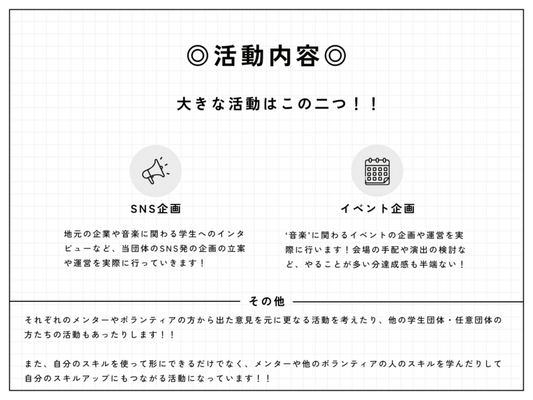 初めてボランティアに参加するっていう人も、イベントの企画にチャレンジしたいっていう人も、誰でもウェルカム!!みんなで楽しいイベントを創り上げていきましょう!!!