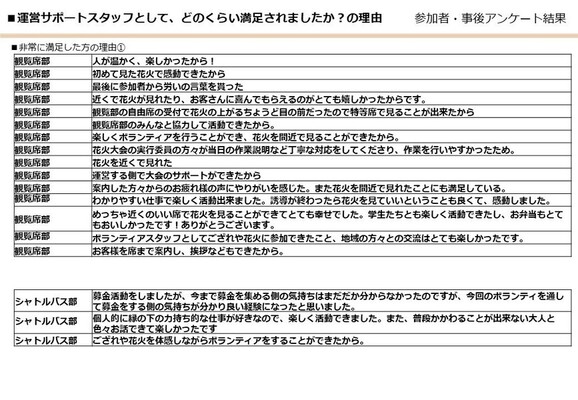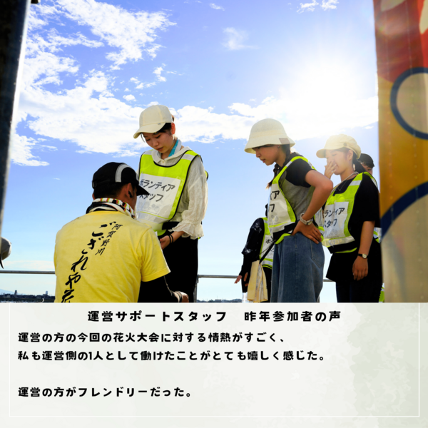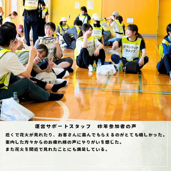 例年ボランティアスタッフの皆様には、素晴らしい花火をより一層輝かせるサポートをいただき感謝申し上げます。