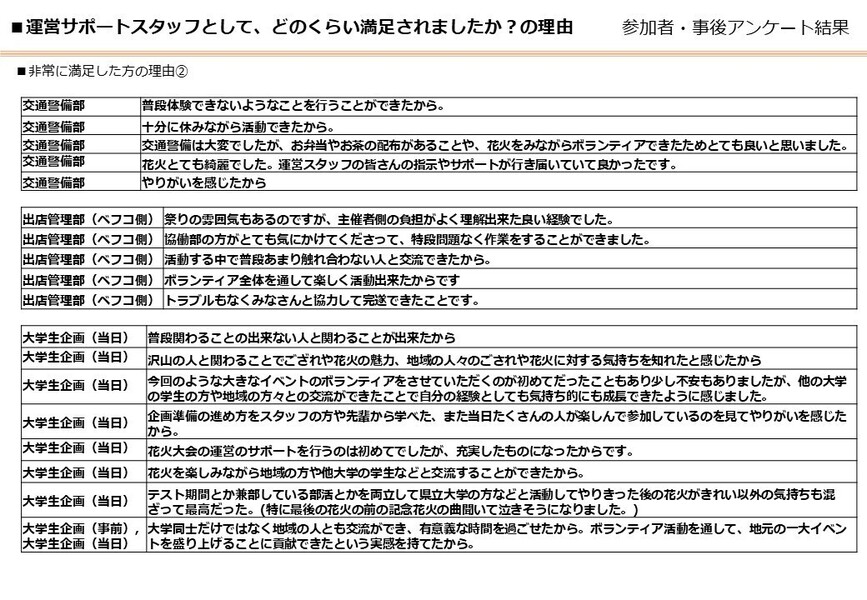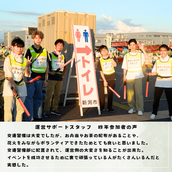 花火大会を運営する中でやり遂げられる想いや、地域の方々との交流を通して、新潟市や住んでいる地域に愛着を持っていただくことができることを望んでいます。