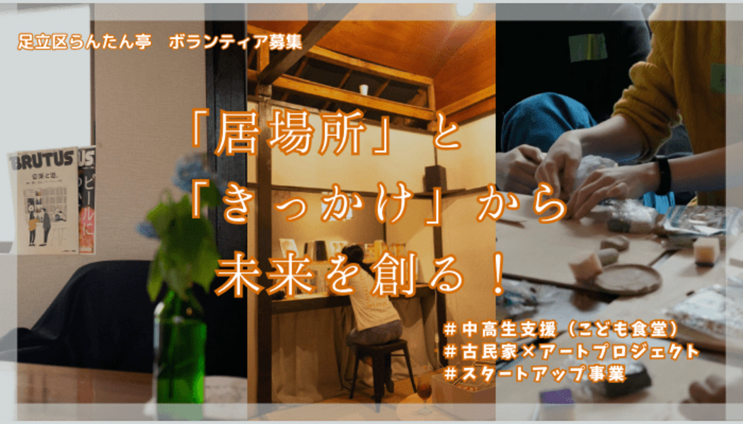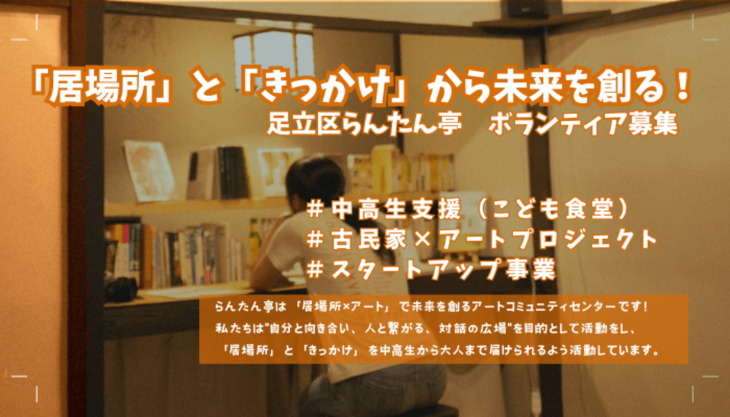 私たちは2021年9月に足立区梅田地域に発足した団体「らんたん亭」です。「居場所」と「きっかけ」を提供する活動を通して "自分と向き合い、人と繋がる、対話の広場"を作っていきます。