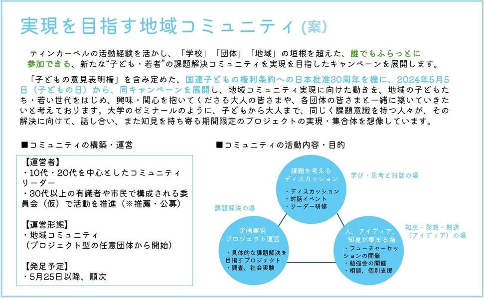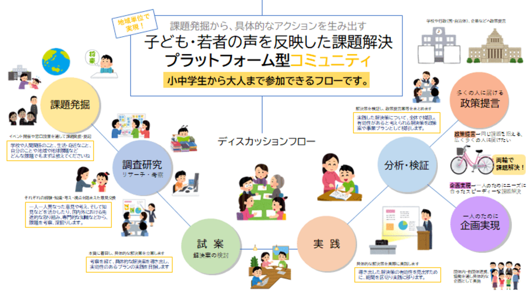 今回、実現を目指す「子ども・若者の課題解決コミュニティ」とは、簡単に言えば課題解決型のディスカッショングループです。子ども・若者を中心に、地域の大人にも協力いただきながら、課題解決に取り組むことを目的としています。
