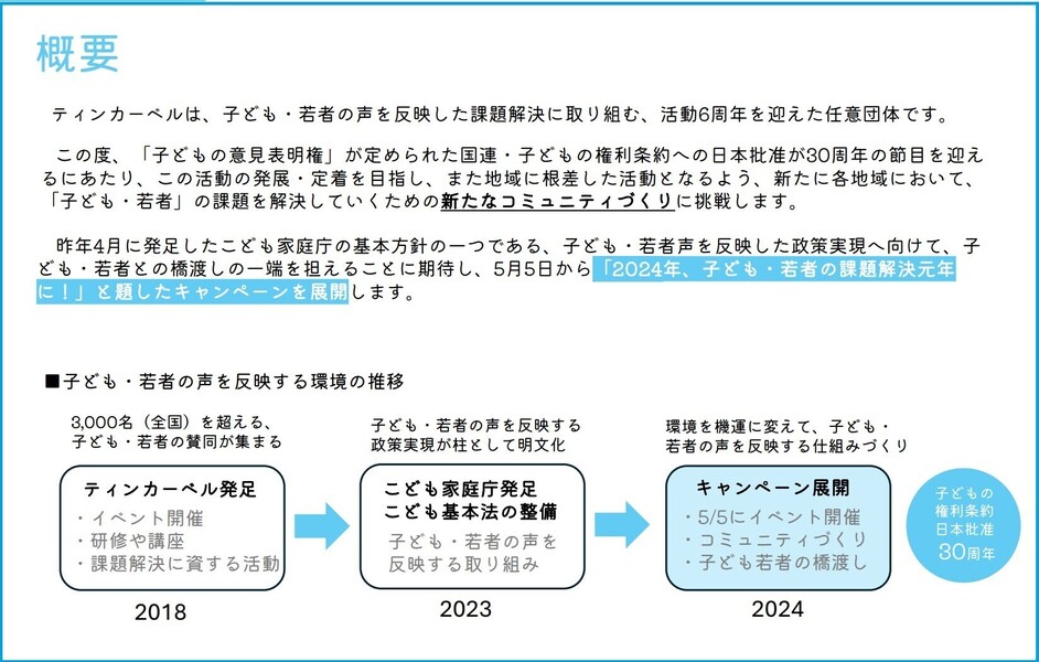 2024年は、国連こどもの権利条約に日本が批准してからちょうど30年を迎えます。この活動では、子どもの権利条約を構成する一つの条項「子どもの意見表明権」を重視した取り組みを進めたいと思っています。