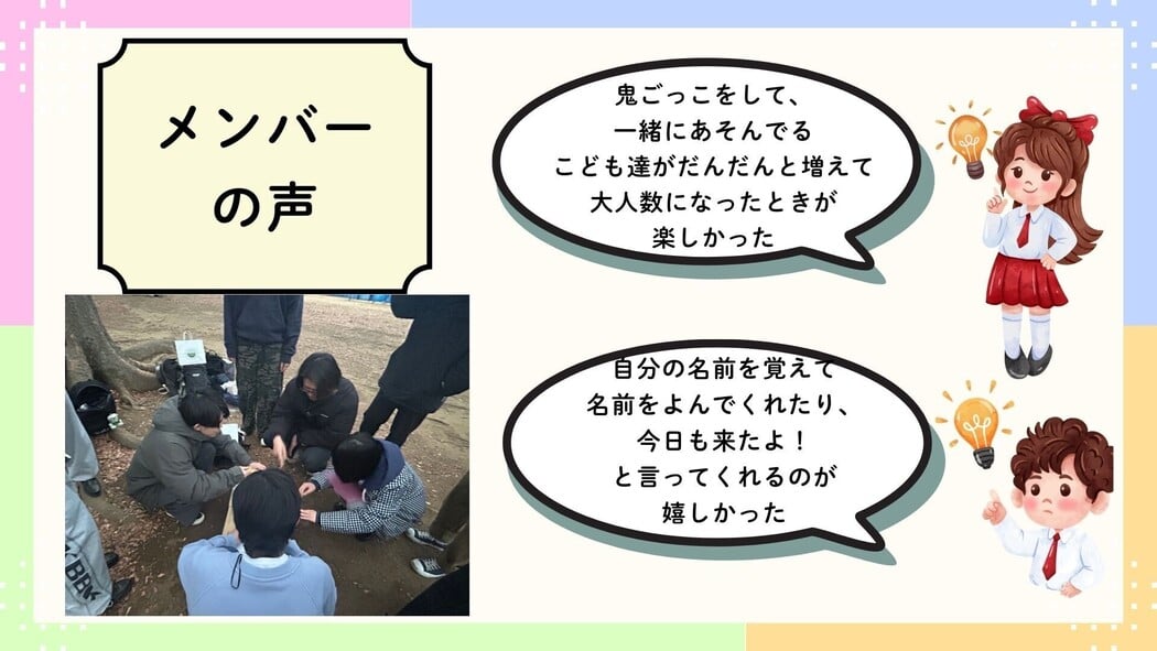 公共の場所である公園だからこそ、どのようなこどもでも訪れることができる。そのような公園にパークリーダーがいることでこどもたちにとっての居場所になると考えています。一人でも多くのこどもの居場所となれるよう、より多くの公園でパークリーダーを実施し、安心して遊べる環境の公園を増やしたいと考えています。現在、パークリーダーは週に2日活動を行っており、より多くのこどもたちの外遊びの環境構築を図るには、まだまだ学生メンバーの人数と地域での認知度が足りません。