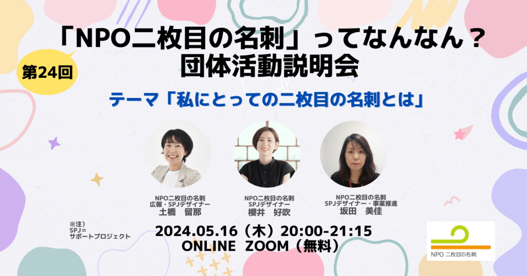 「二枚目の名刺」では、いま所属する組織や家庭から一歩踏み出したいと感じている人へ、挑戦する機会であるサポートプロジェクトを届けています。サポートプロジェクト(以下SPJ)では、NPO団体が向き合っている社会課題に対して、多様なメンバーと交流しながら、課題解決に取り組んでいます。参加メンバーは、その経験を自分自身の変化・成長につなげています。この説明会では、二枚目の名刺の「中の人」であり上記活動に伴走している、一枚目(本業)を持ちながら二枚目の活動している3名が登場し、弊団体のミッション・ビジョンと活動を知っていただく機会をお届けします。🔳今回のテーマ
