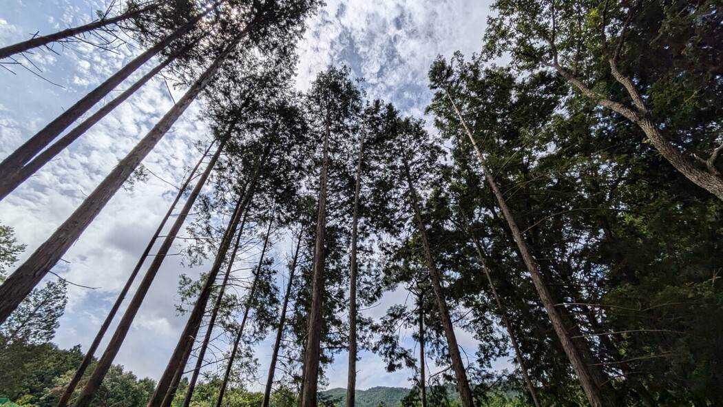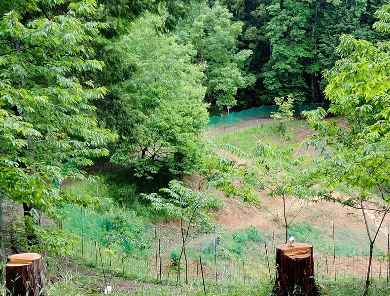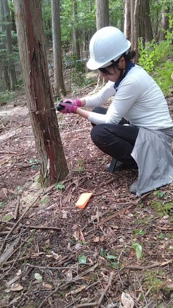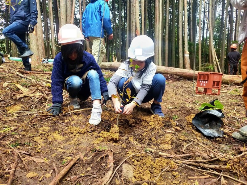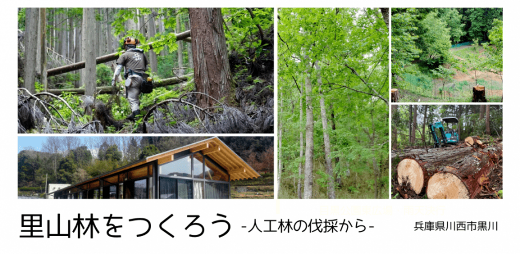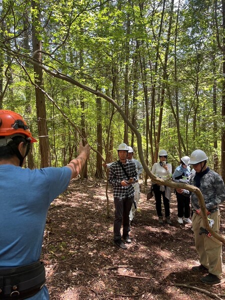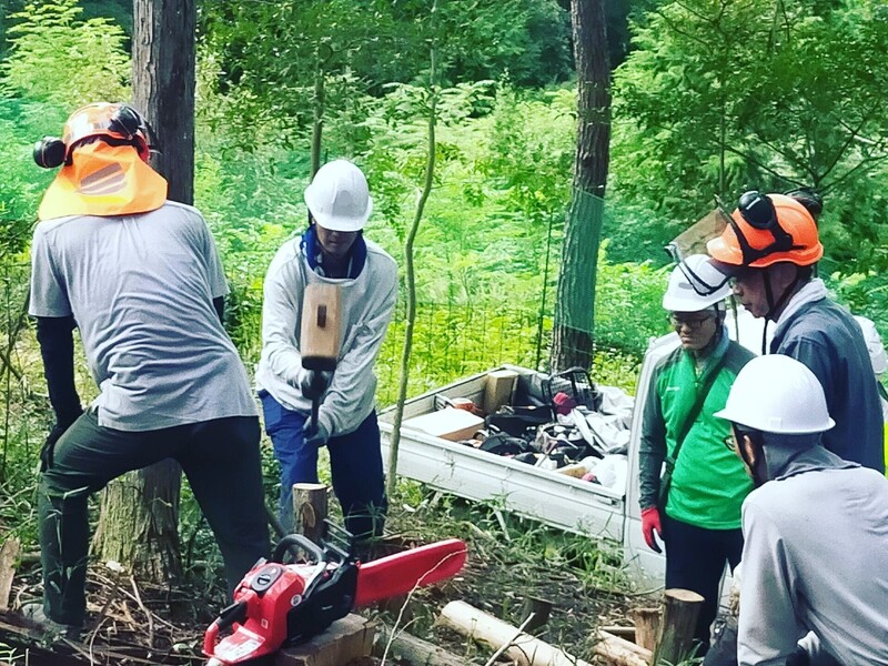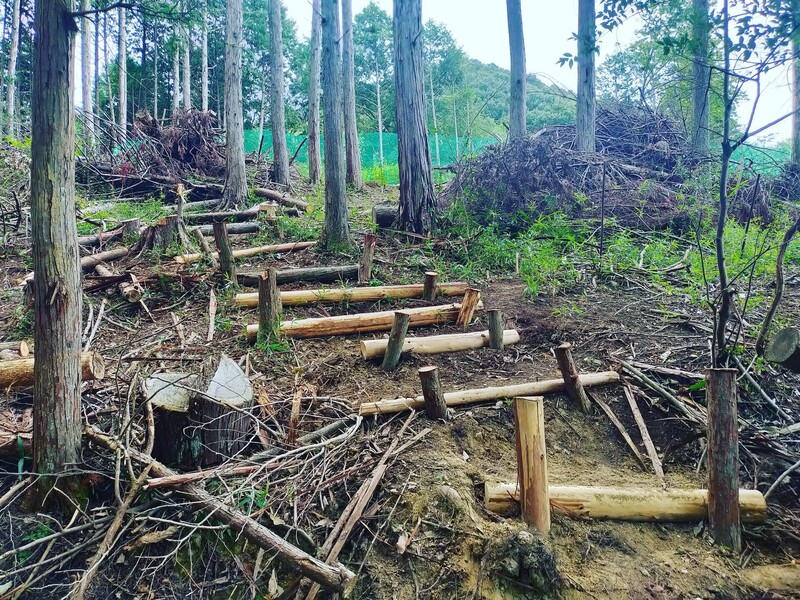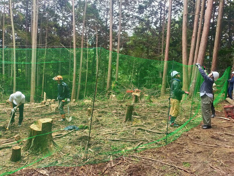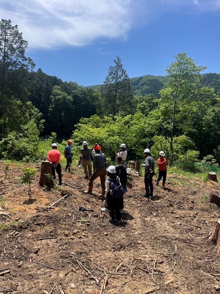 このイベントでは、ヒノキなどの人工林を伐採し道を通し、里山林をつくっています。