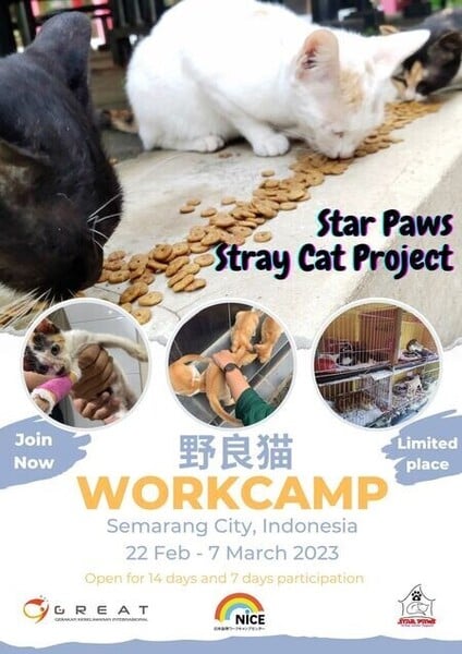 GREAT (Gerakan Kerelawanan Internasional)と2022年から共催。GREATは1999年設立のNGO・IIWCの元職員・元会員が中心になって、2015年に設立した国際ボランティアNGO。赤ちゃん猫が邪魔になり、箱に入れられて路上や市場に捨てられる例が後を絶たない。野良猫は無視され、害悪視までされながら大多数が野垂れ死に、人間がゆっくり殺しているのと変わらない。GREATはスマランの社会起業家のペットショップ「Star Paws」と協力し、野良猫の生活を向上する活動を実践中。活動は路上で野良猫に適切な食事と清潔な水を提供する給餌から始まった。そして病気で投薬が必要な猫には、その場で治療を実施。必要に応じて獣医師による診察も行われ、個体数を抑制するため、去勢手術を行う資金も調達している。