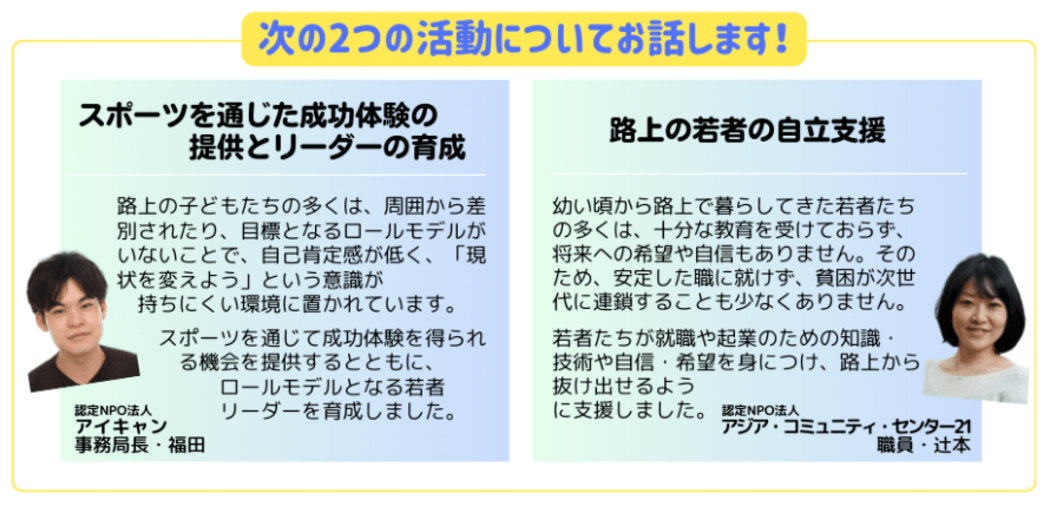 - 実施団体からの活動報告・認定NPO法人アイキャン・認定NPO法人アジア・コミュニティ・センター21