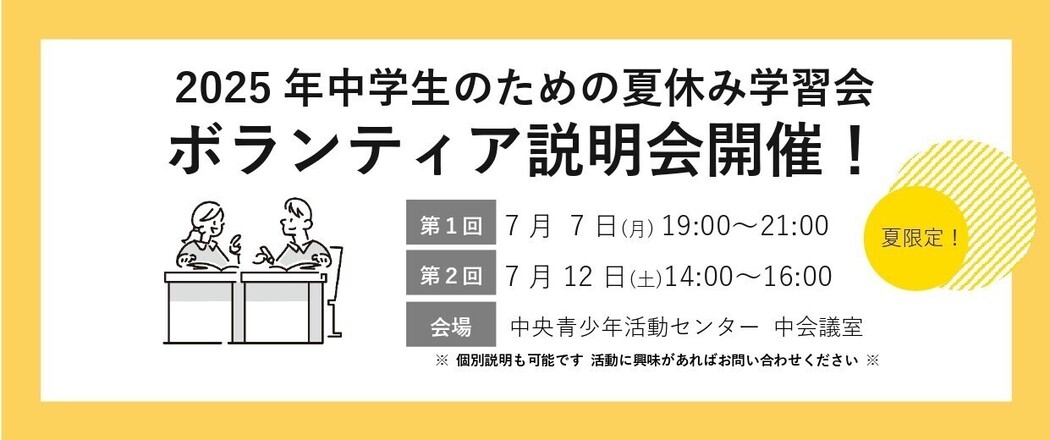 - 【7/7(月)・12(土)実施】2025年度夏休み学習会ボランティア説明会