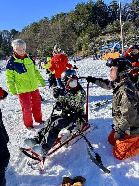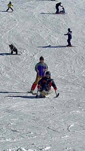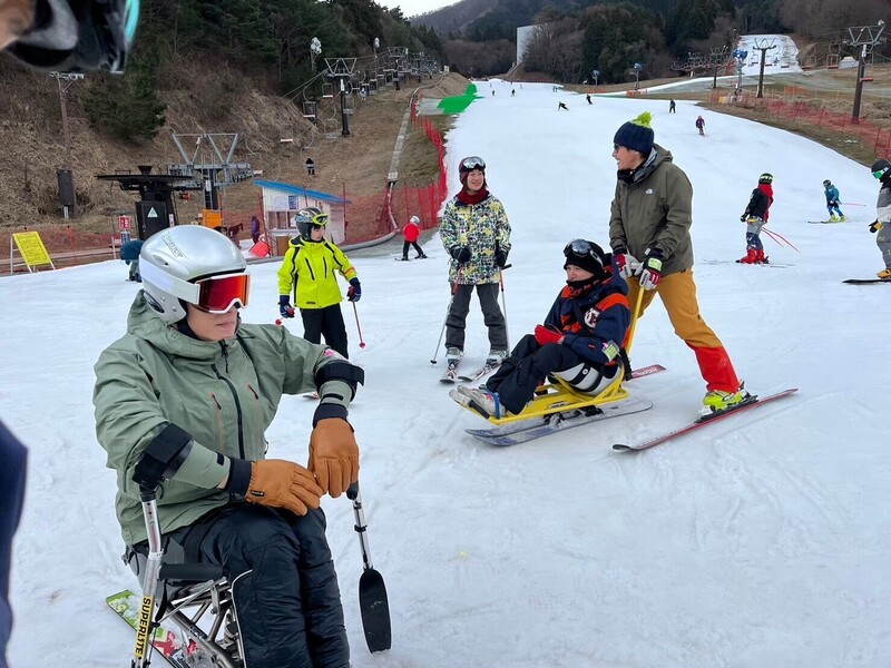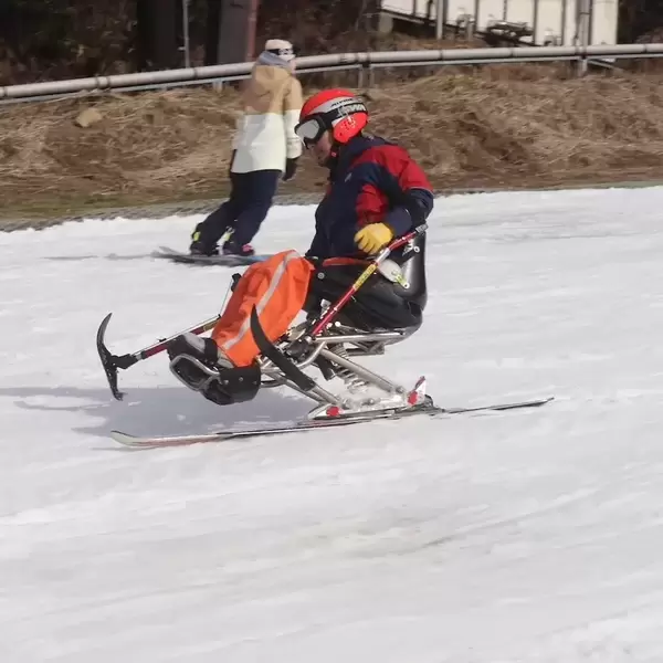 スキーに挑戦したい身体障がい者の方の第一歩をサポートするボランティアです。バイスキーと呼ばれる車椅子に似たスキーを使って後ろを待ち、一緒に滑って楽しみます!