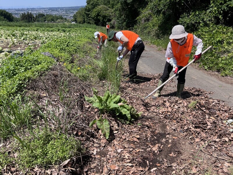 参加者さんは全員よいおやさいのビブスを着て作業します。参加メンバーがわかる上に道路などからも活動していることがわかり、一体感が生まれます。
