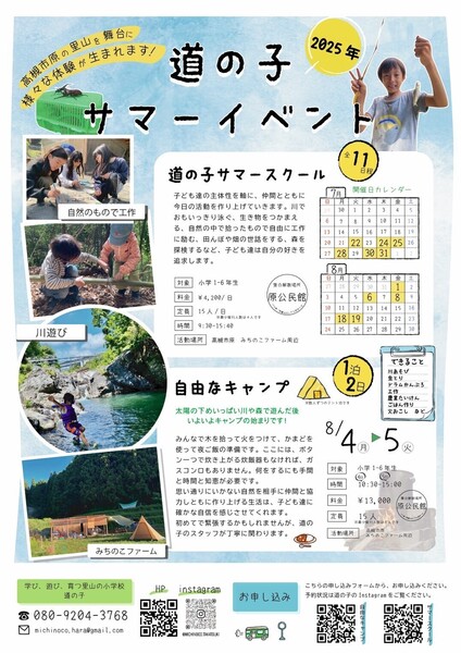 子ども達は川へ山へどんどん繰り出していきます。カリキュラムも筋書きもない、道の子のサマースクールでは子ども達の主体性が鍵になります。子ども達の自由な活動を応援し、巻き起こる数々の体験をその子の糧となるよう支援する役割を担っていただきます。授業やスポーツのような、知識や技術を教える教育ではありません。強さや優しさ、美しさや感動などがサマースクールでは鍵となってくるでしょう。