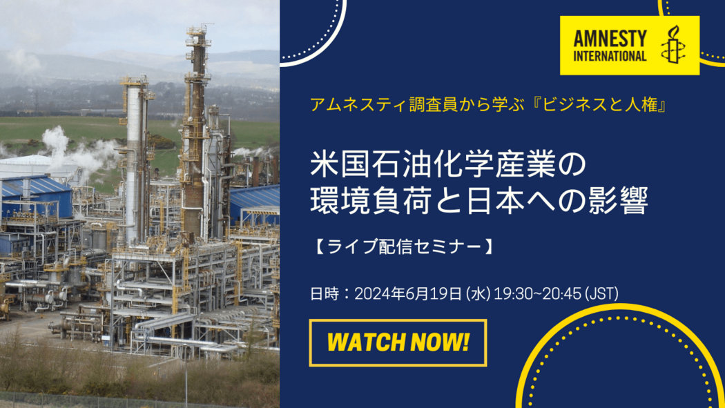 アムネスティ・インターナショナル日本は、ビジネスと人権をめぐるオンラインセミナーを開催します。今年1月に発表された報告書、「ビジネスの代償?米国における石油化学産業の有害な汚染」を紹介し、石油化学産業に関連する人権、環境、気候への害と日本への影響について掘り下げます。